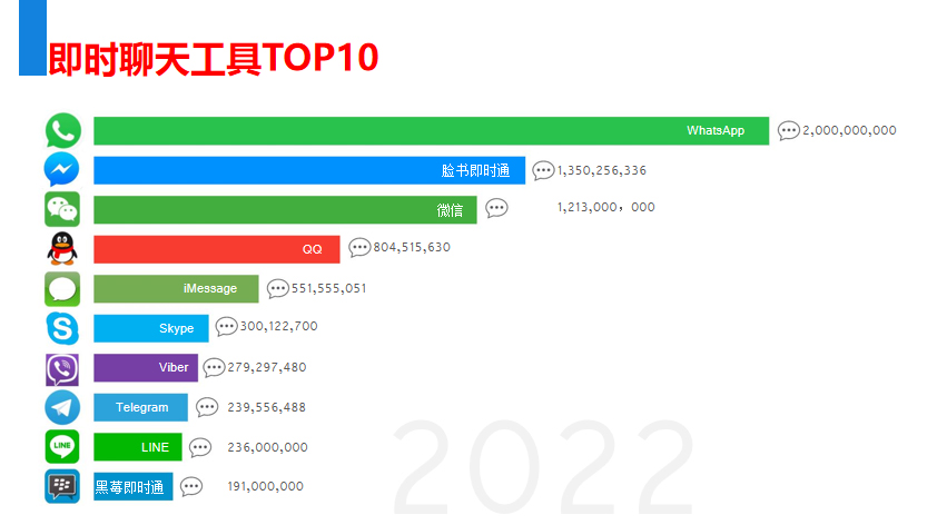 作为2022年全球最火爆社交媒体top3的WhatsApp,凭借每天10亿日活量,650亿条消息以及语音、视频通话的时间超20亿分钟和在谷歌应用商店即时聊天软件类别中下载量排名第一的惊人统计数据。被外贸行业称为货真价实”世界级”的聊天软件。