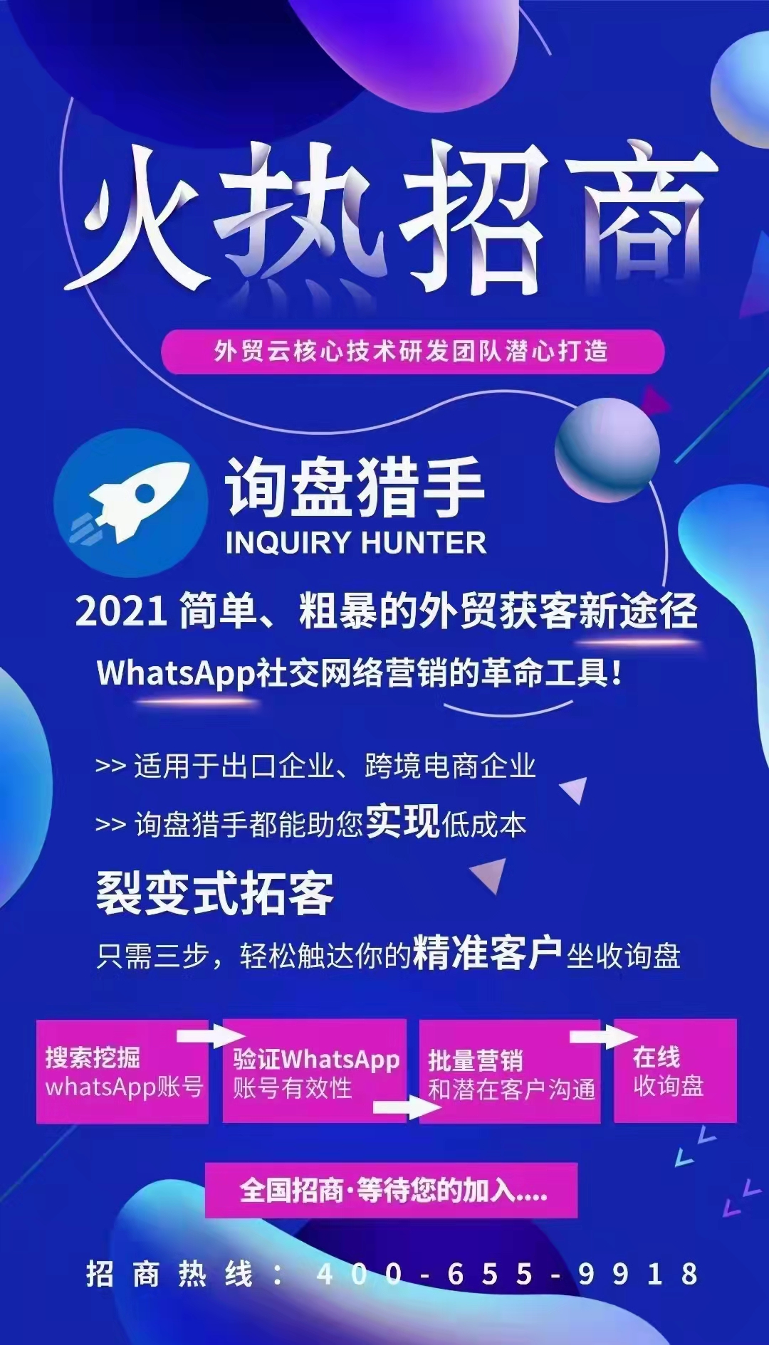 询盘猎手助力外贸企业快速找到国外WhatsApp用户,不打一个电话、不投一分钱广告,实现精准采集、裂变与群发,低成本实现高流量。